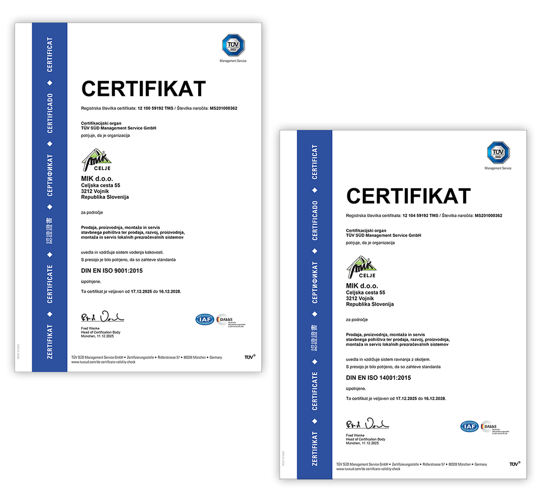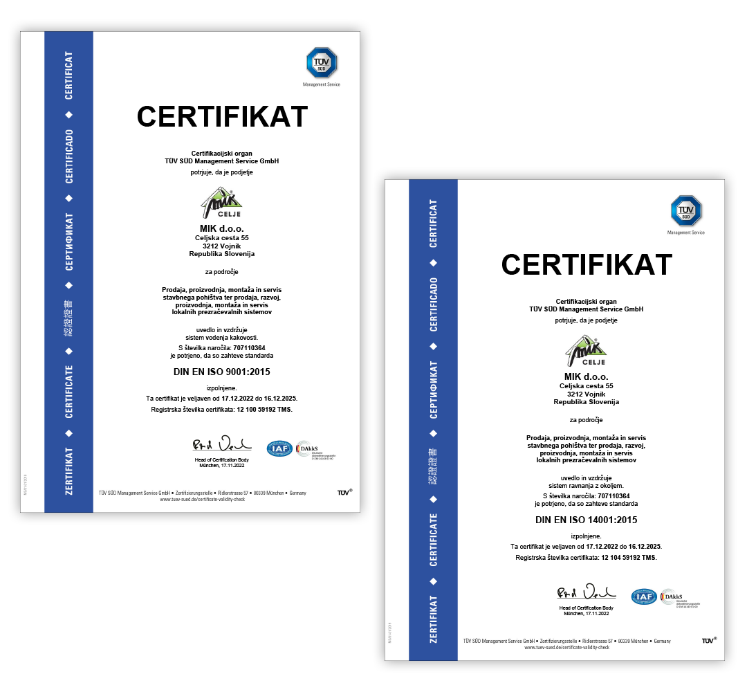 Bei MIK Celje sind wir stolz auf jede Anerkennung und jedes Zertifikat, die unserer Arbeit Wert und Gewicht verleihen, sowie auf den Aufwand, den wir in die Entwicklung und Produktion hochwertiger Bauelemente und Belüftungssysteme investieren:
